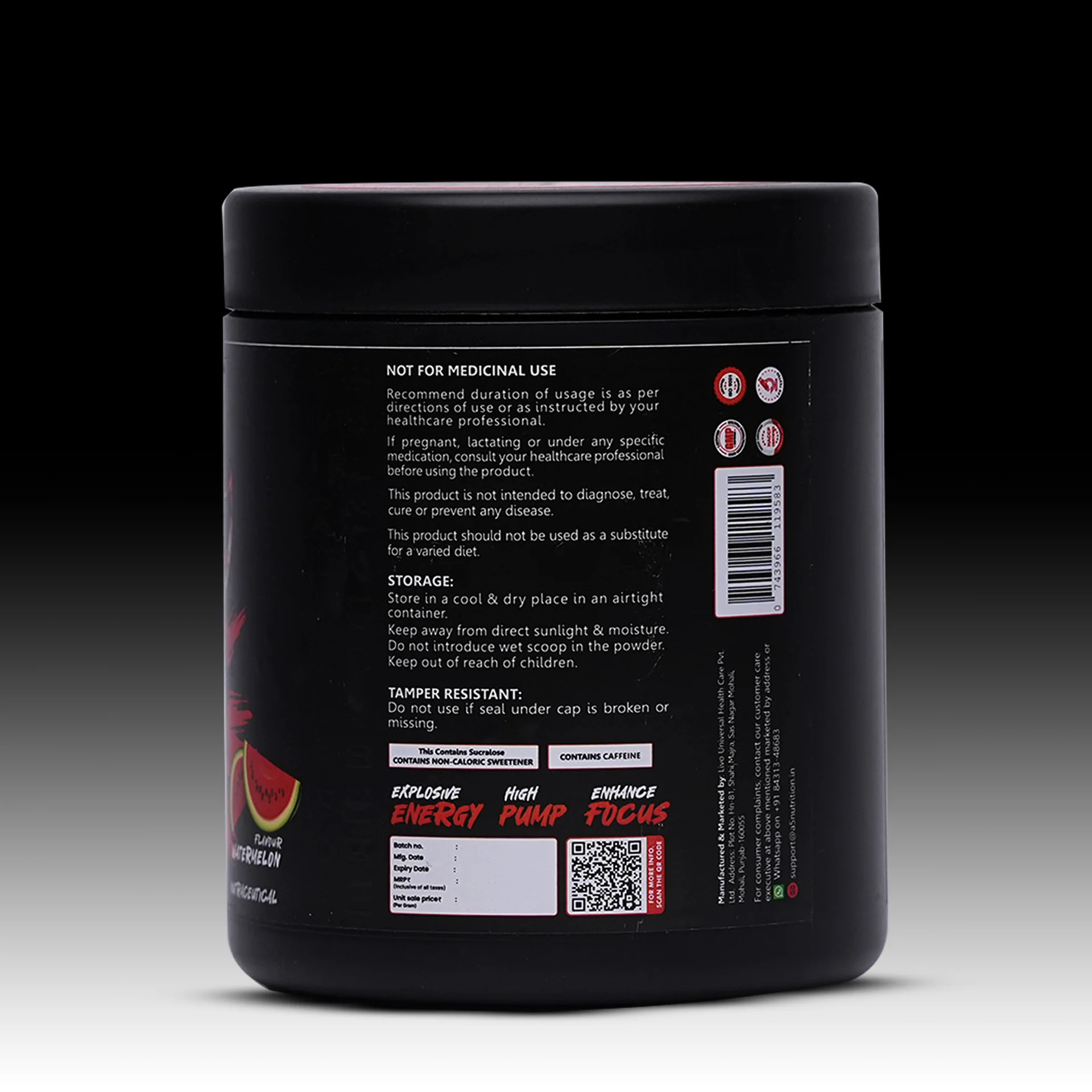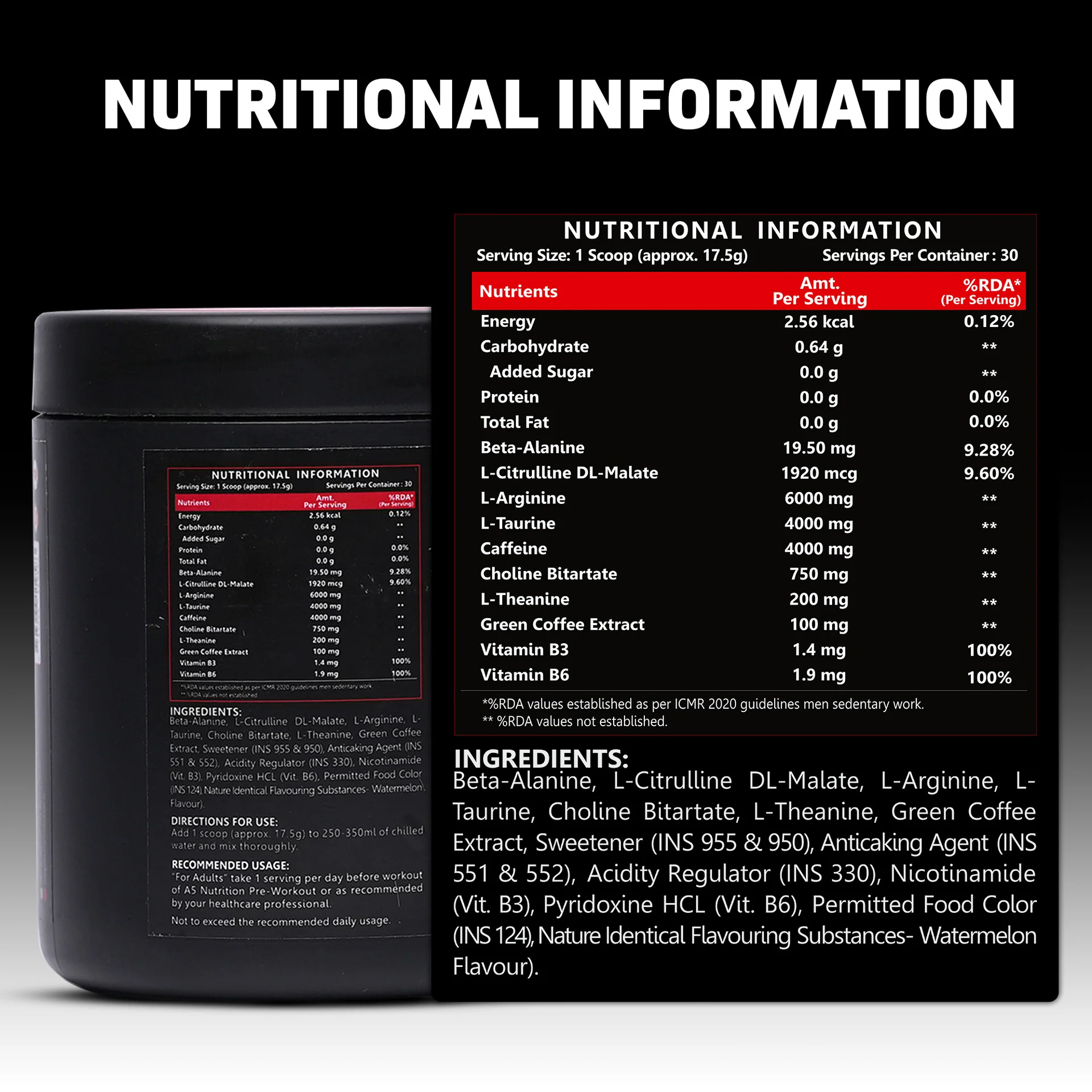 The formula combines L-Arginine, L-Citrulline DL-Malate, Beta-Alanine, Taurine, and Caffeine to help support increased blood flow, improved endurance, and enhanced workout focus.